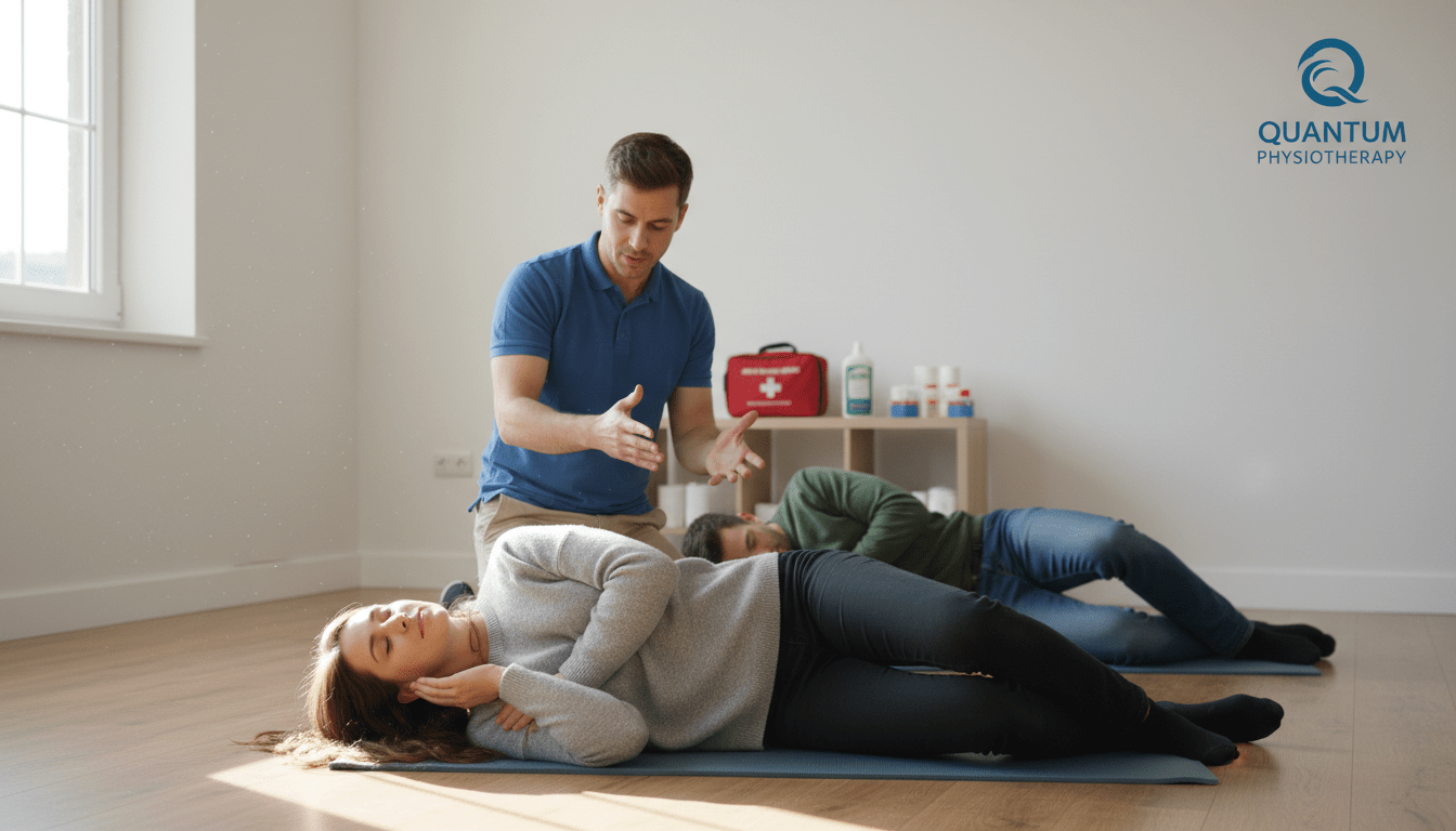 A professional setting depicting the side recovery position, featuring a male and female figure in modest casual clothing. The foreground shows the female figure lying on her side, demonstrating the recovery position, her body angled slightly to capture the correct posture. In the middle ground, an instructor is gently guiding the male figure, who is on the floor, into the side recovery position, demonstrating a supportive and educational environment. The background features a bright, well-lit room with soft natural light filtering through a window, providing a warm and reassuring atmosphere. The room includes basic medical supplies subtly placed, signaling a sense of preparedness. The logo for "Quantum Physiotherapy" is present in the corner of the image, providing a touch of professionalism without cluttering the scene.