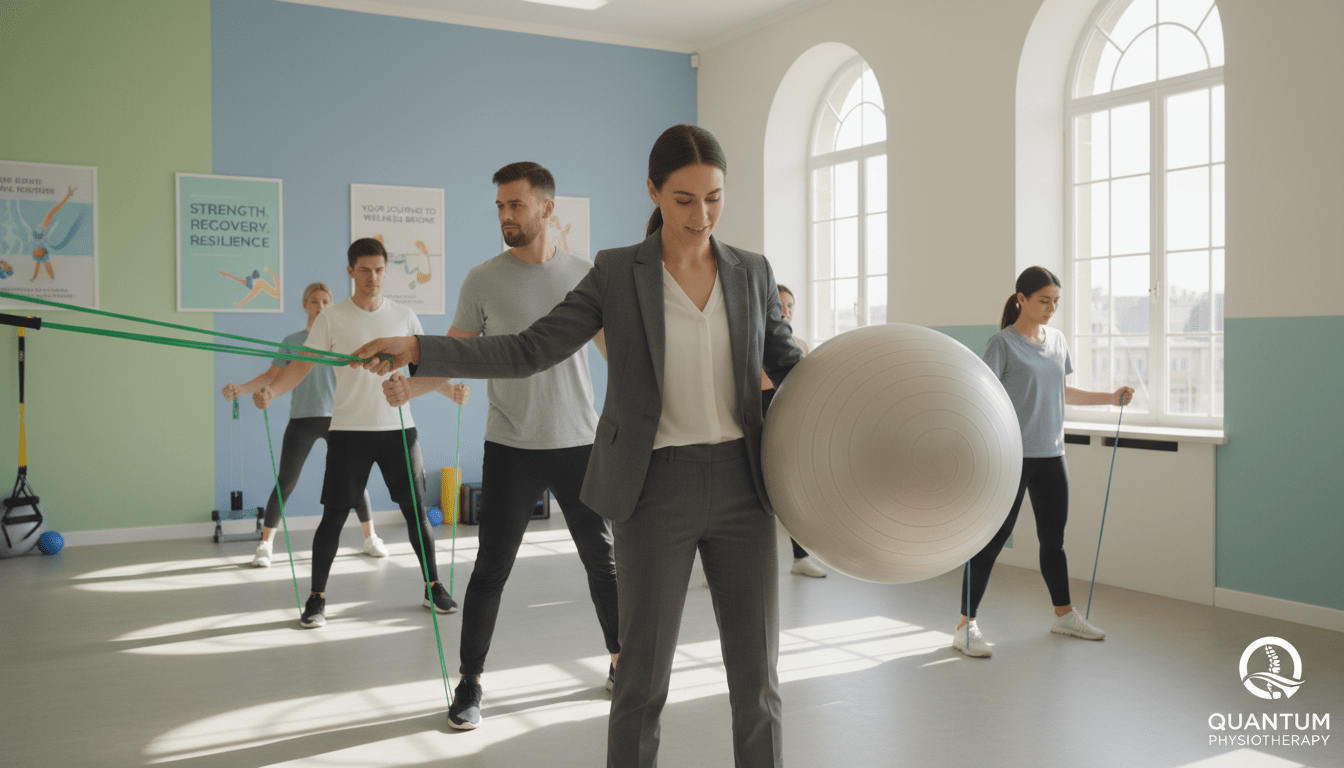 A serene rehabilitation room featuring a diverse group of individuals, both men and women, engaged in core orthopedic rehabilitation exercises. In the foreground, a female physiotherapist, dressed in a professional business attire, demonstrates a stability ball exercise, emphasizing correct posture and technique. To the left, a male patient practices resistance band exercises with focused determination. In the background, large windows let in natural sunlight, illuminating the space and creating a warm, inviting atmosphere. The walls are adorned with motivational posters related to strength and recovery. Soft, calming colors dominate the room, enhancing a sense of tranquility and hope. Show the logo of "Quantum Physiotherapy" subtly in the corner to signify the facility. Use a slightly elevated angle to capture the scene effectively, conveying an inspiring and supportive environment for rehabilitation.